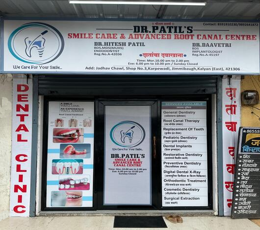 Located in the heart of Kalyan (East), Dr. Patil's Smile Care & Advanced Root Canal Centre offers world-class dental care with a focus on precision, hygiene, and patient comfort. Whether it's relieving pain through root canal therapy or restoring smiles with dental implants, our clinic delivers personalized treatment using advanced techniques.